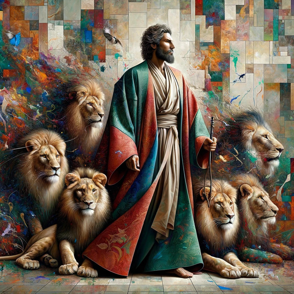 A recreated image featuring the biblical character Daniel in the Lion's Den. Daniel is depicted in an elegantly tailored biblical robe, blending traditional and modern styles, surrounded by artistically rendered lions in vibrant jewel tones.
