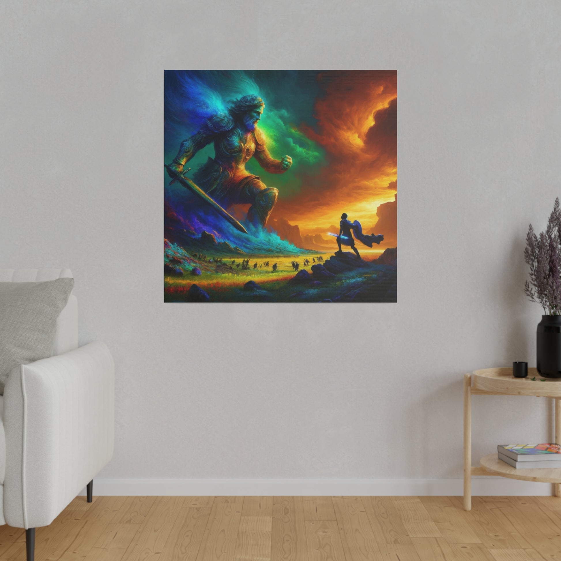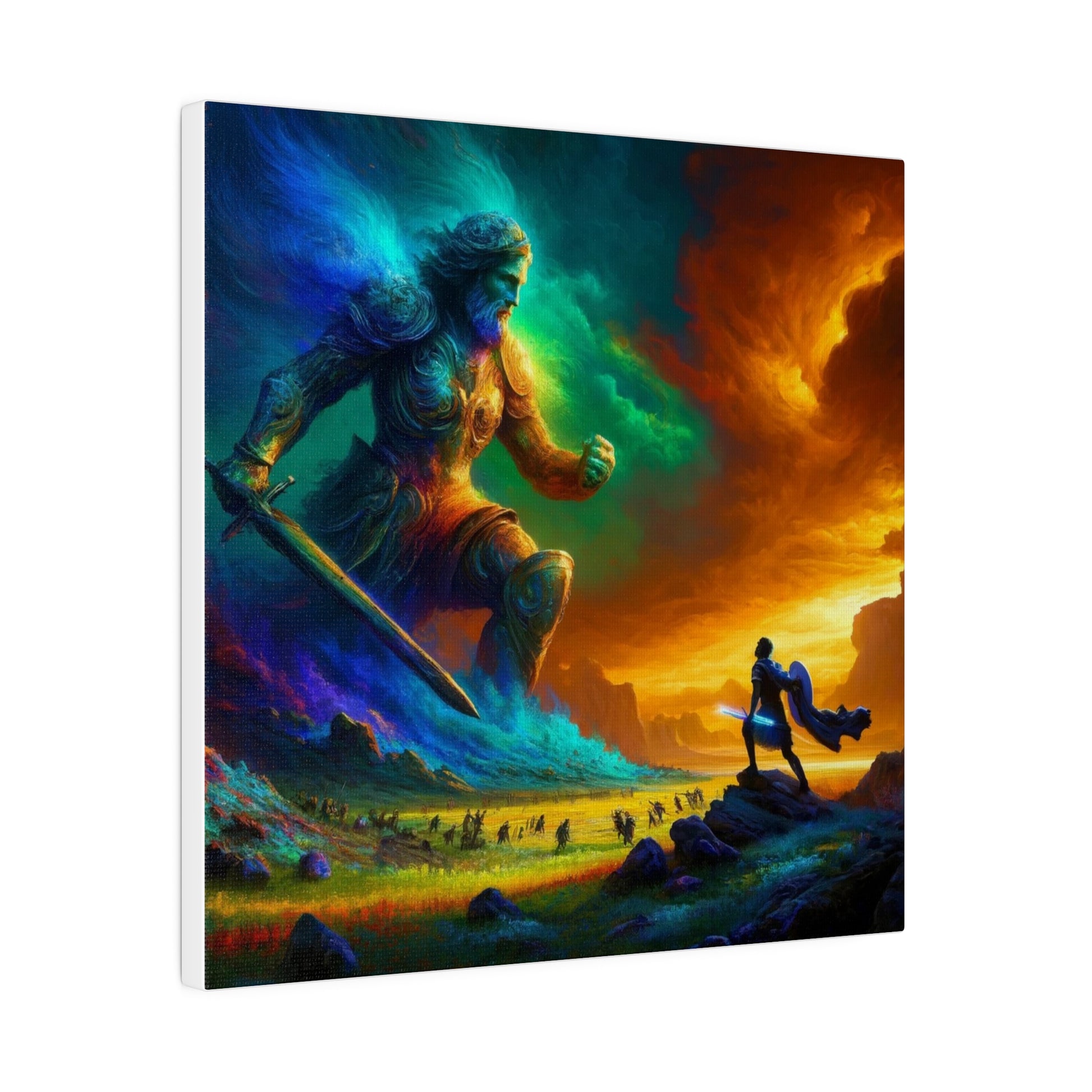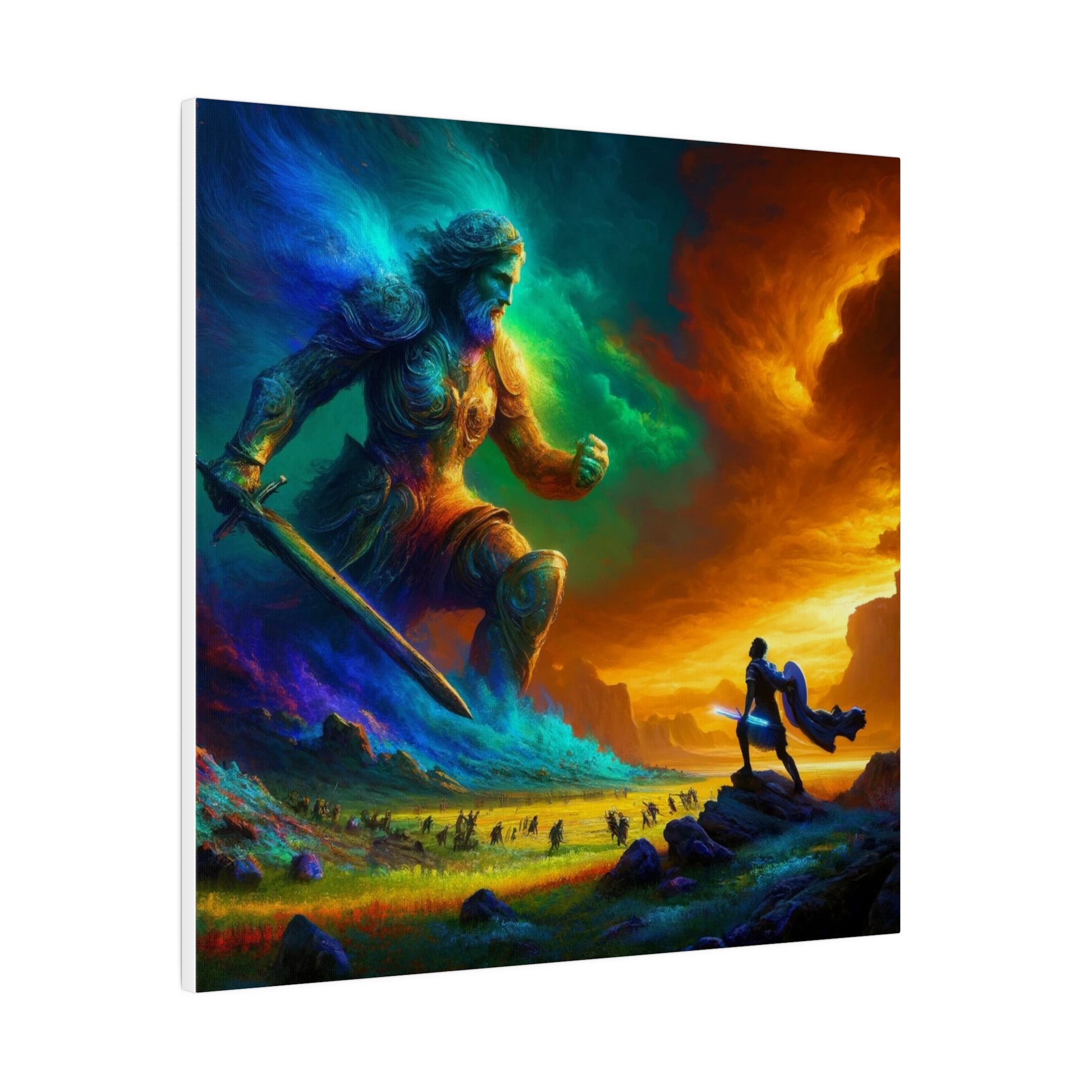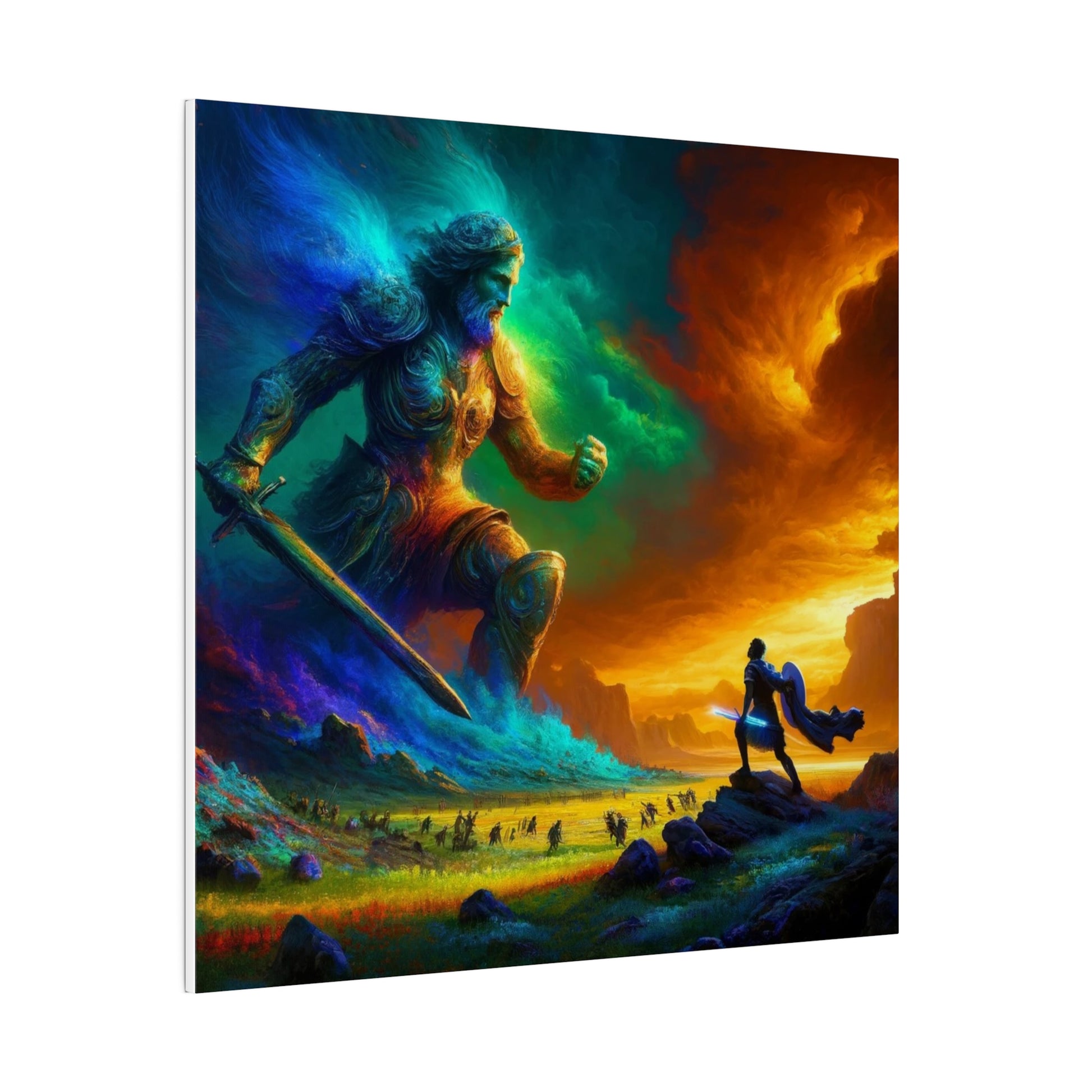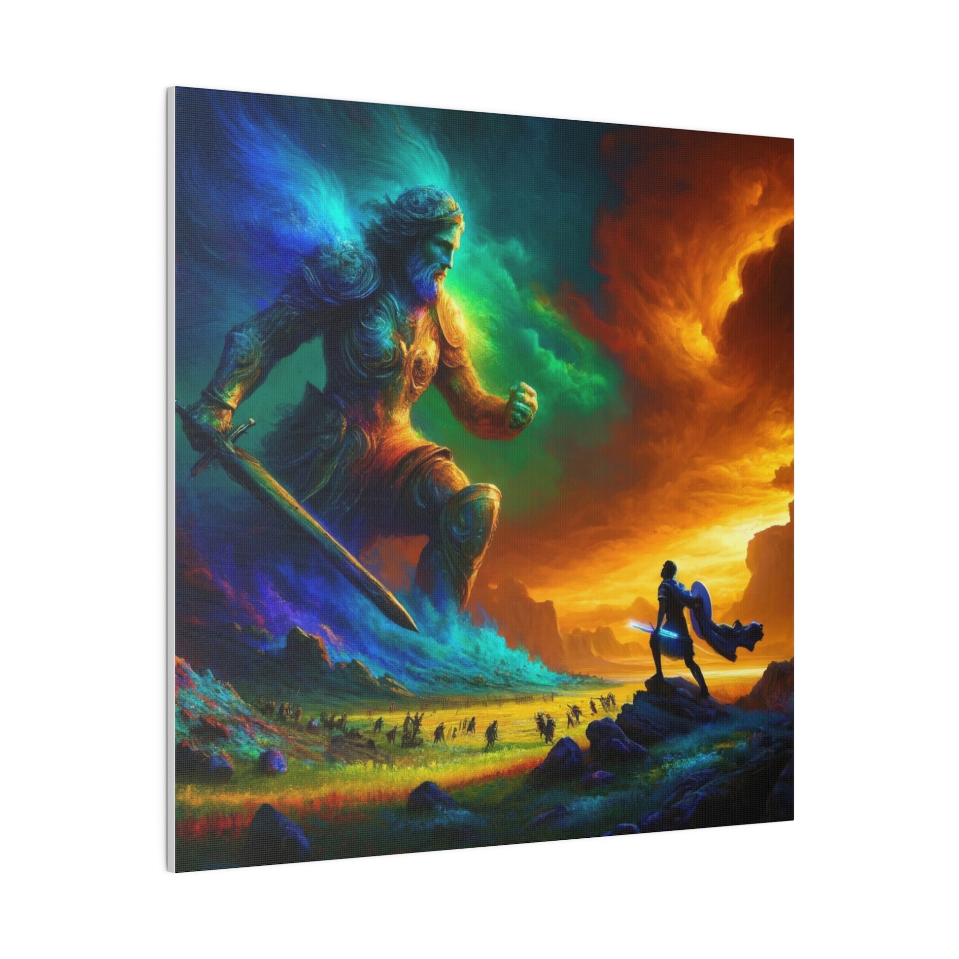 David and Goliath battle, featuring even more intense color contrasts and vibrant elements.