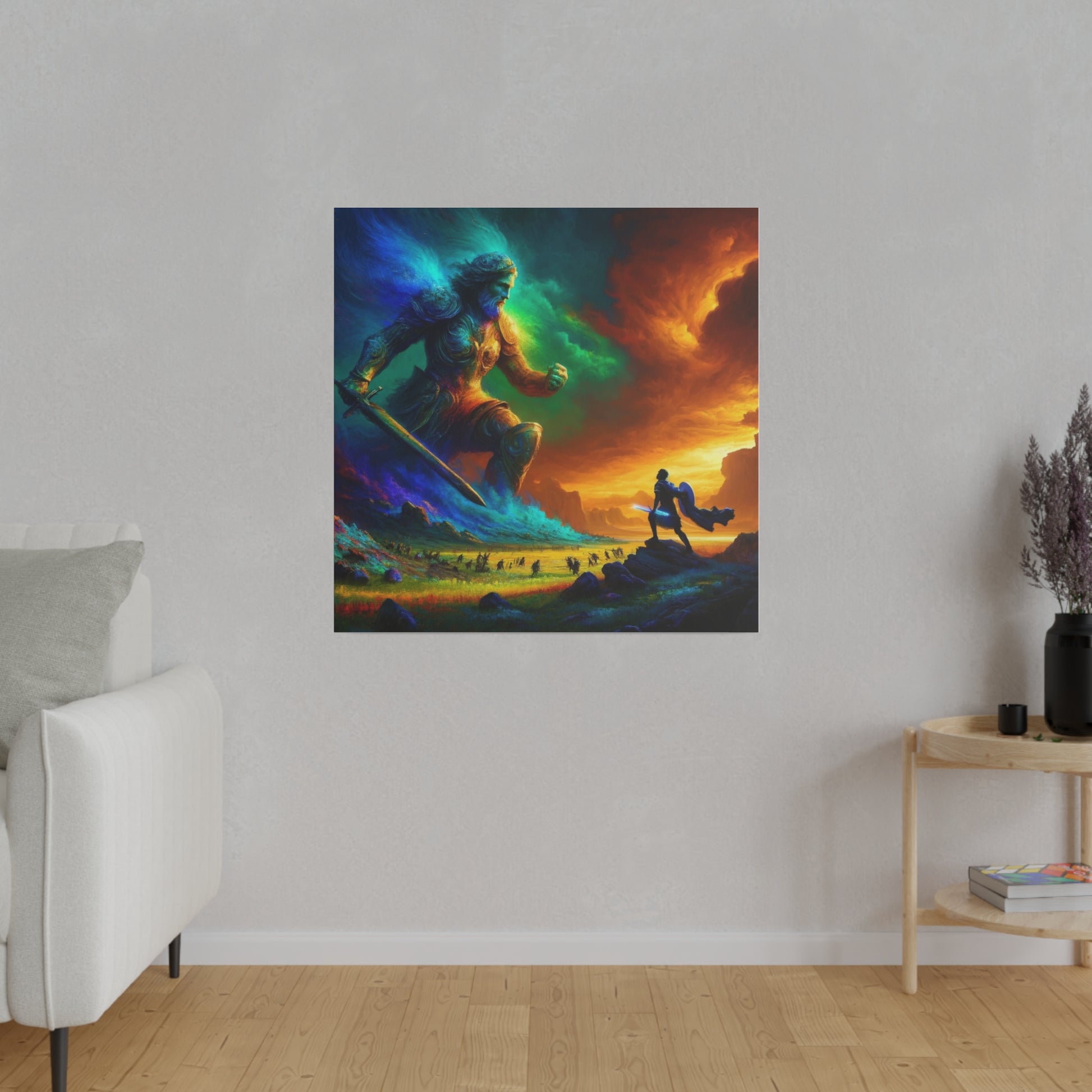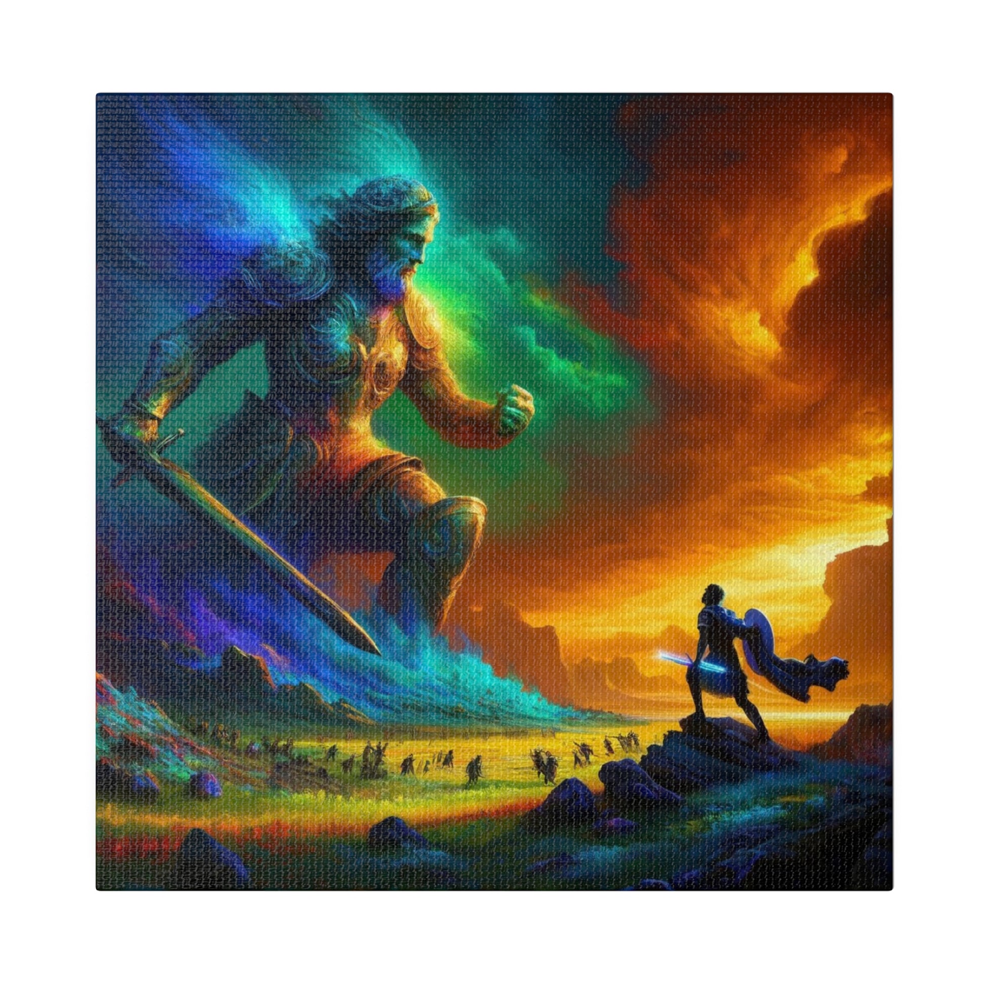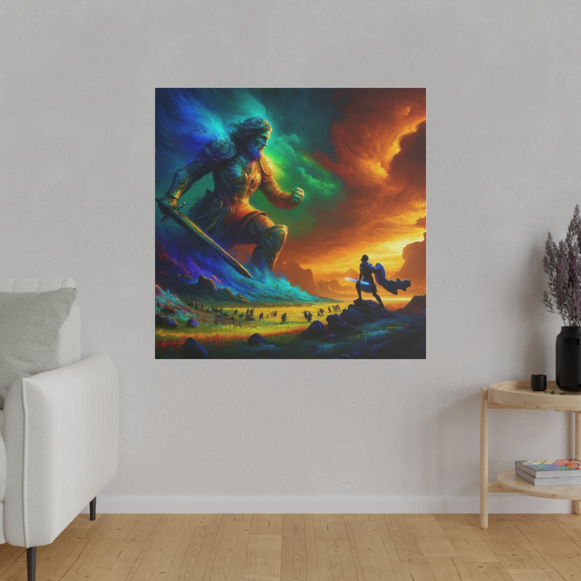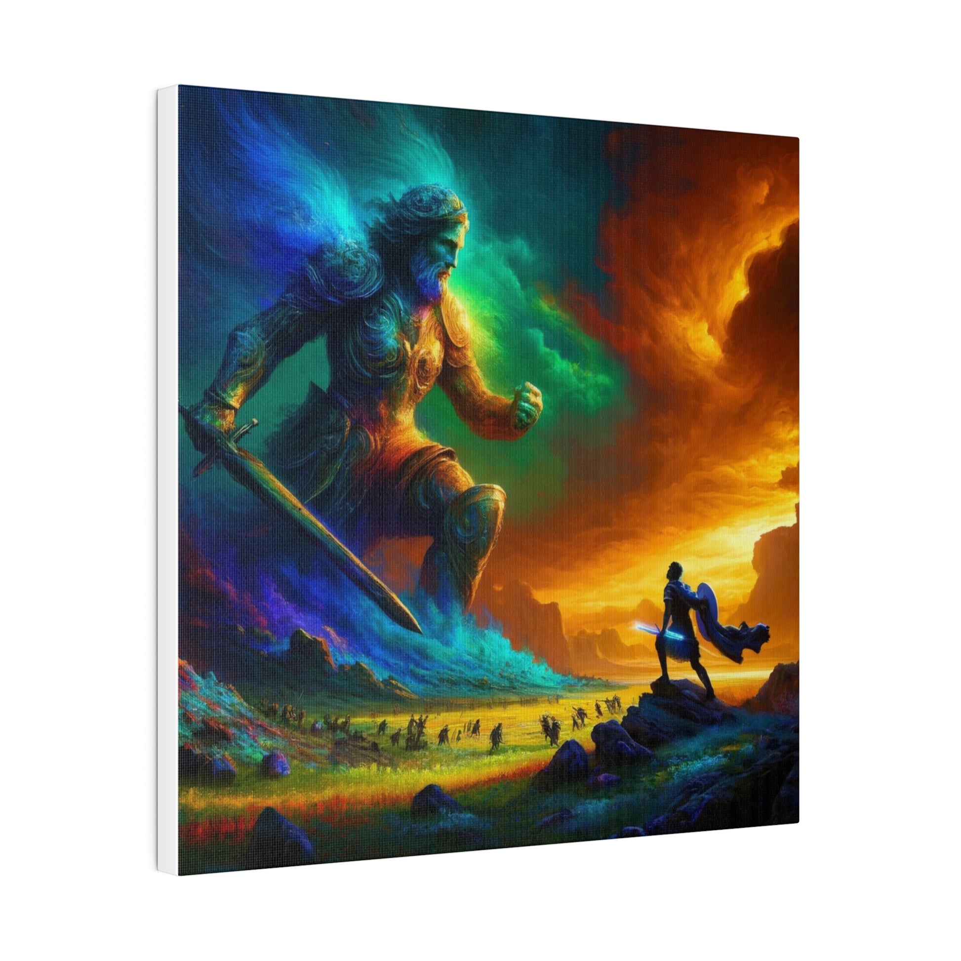 David and Goliath battle, featuring even more intense color contrasts and vibrant elements.