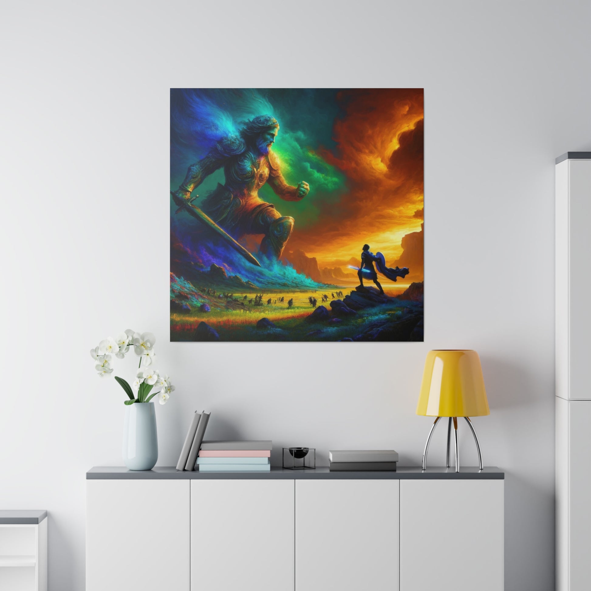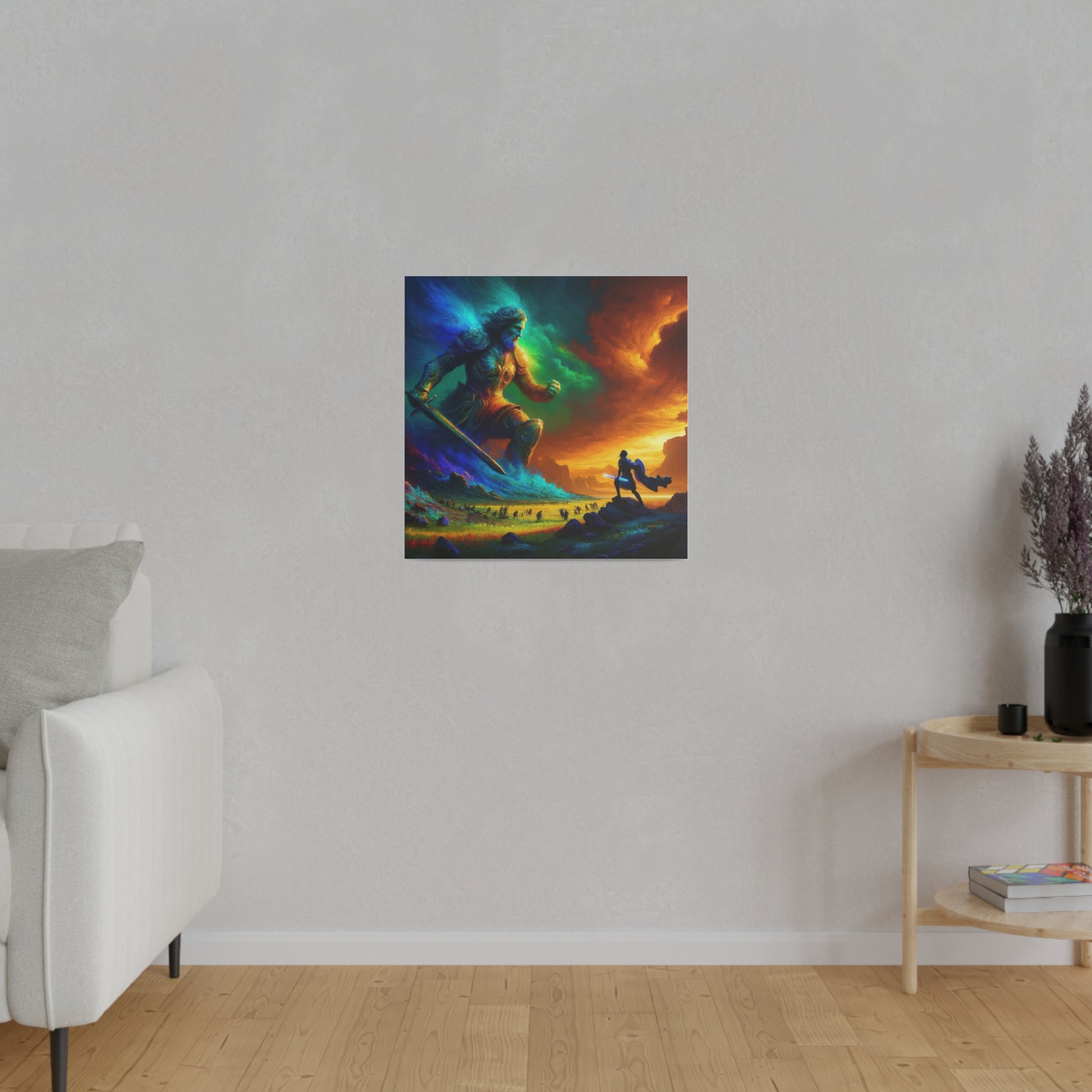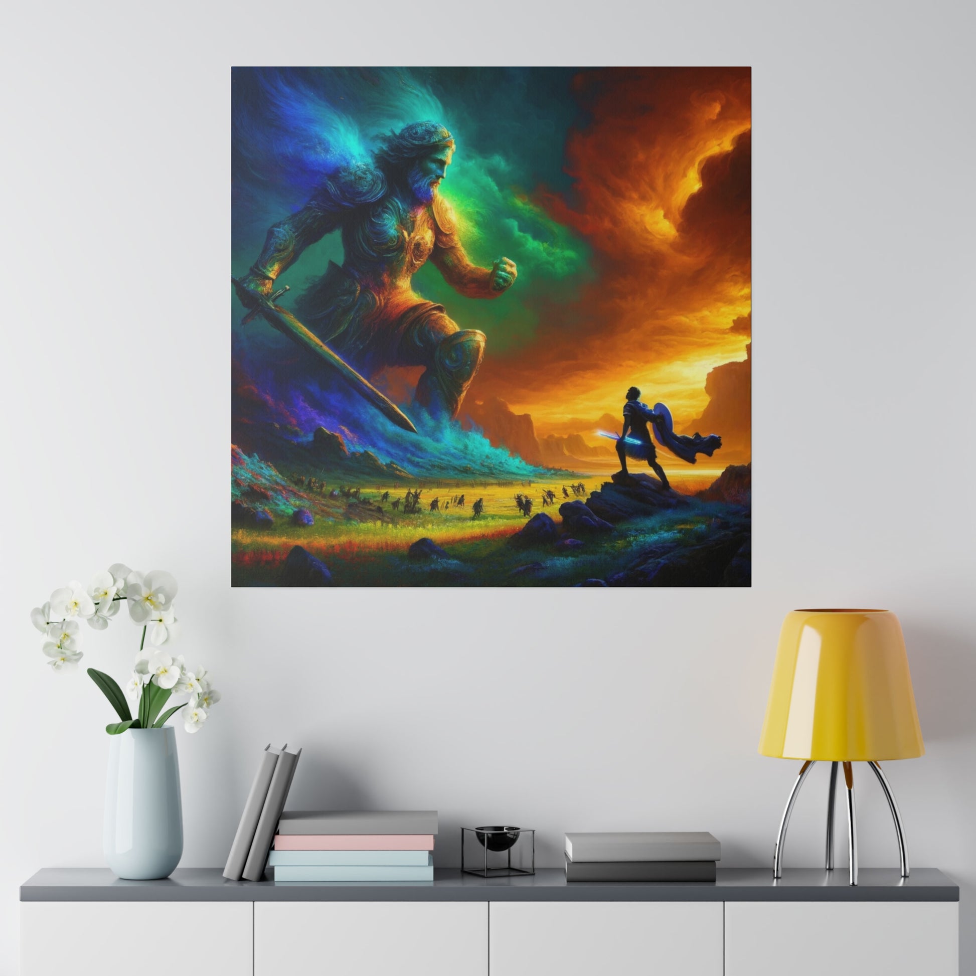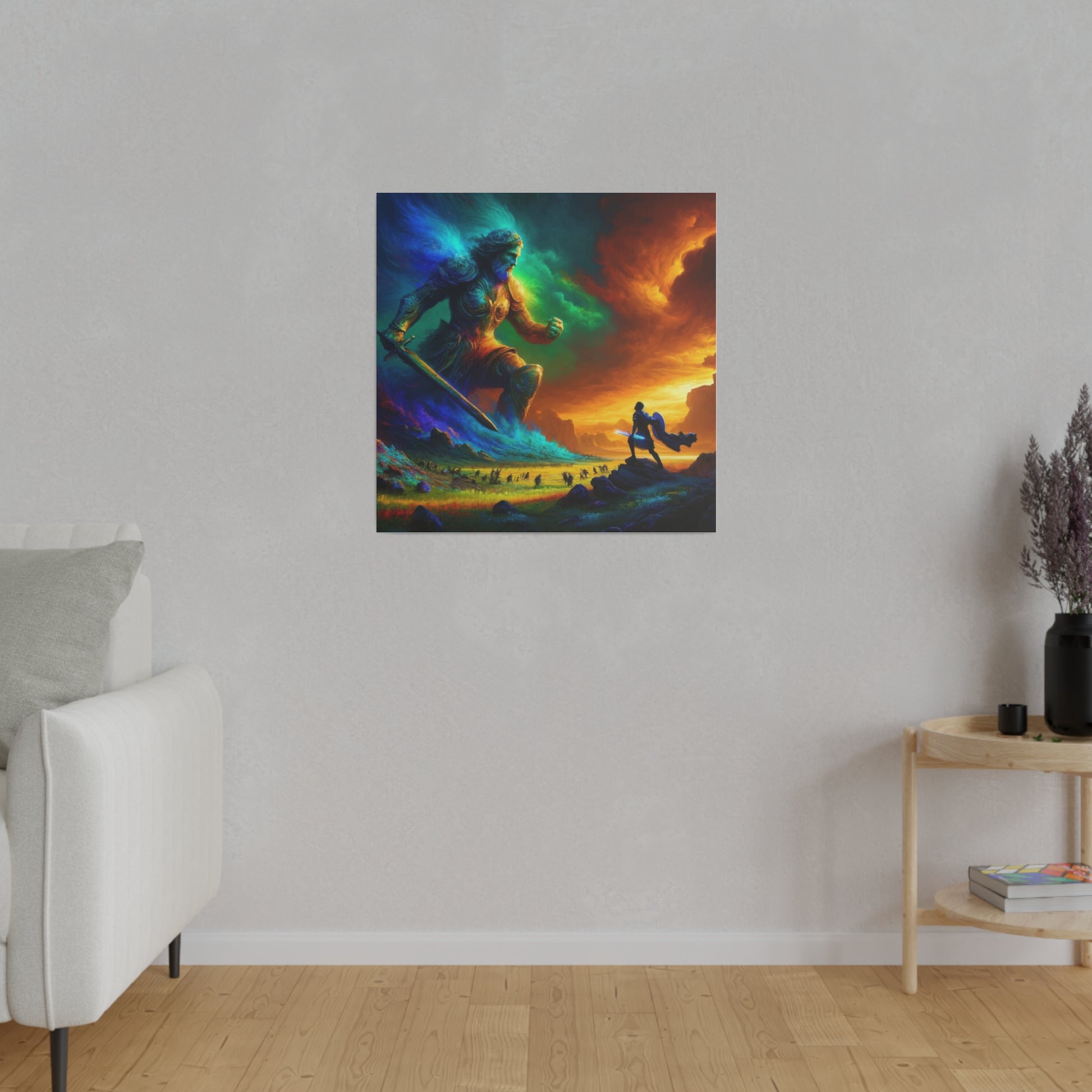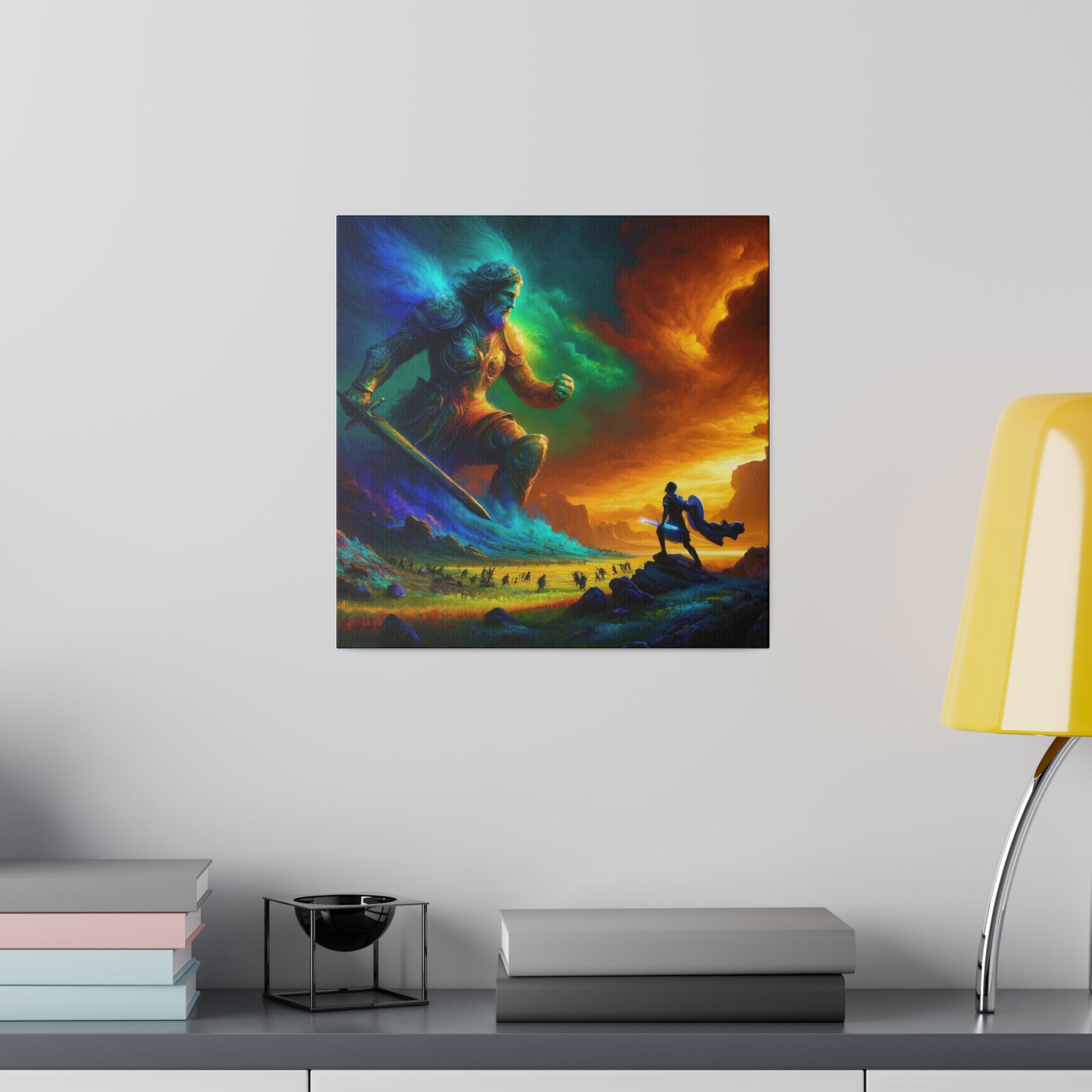 David and Goliath battle, featuring even more intense color contrasts and vibrant elements.