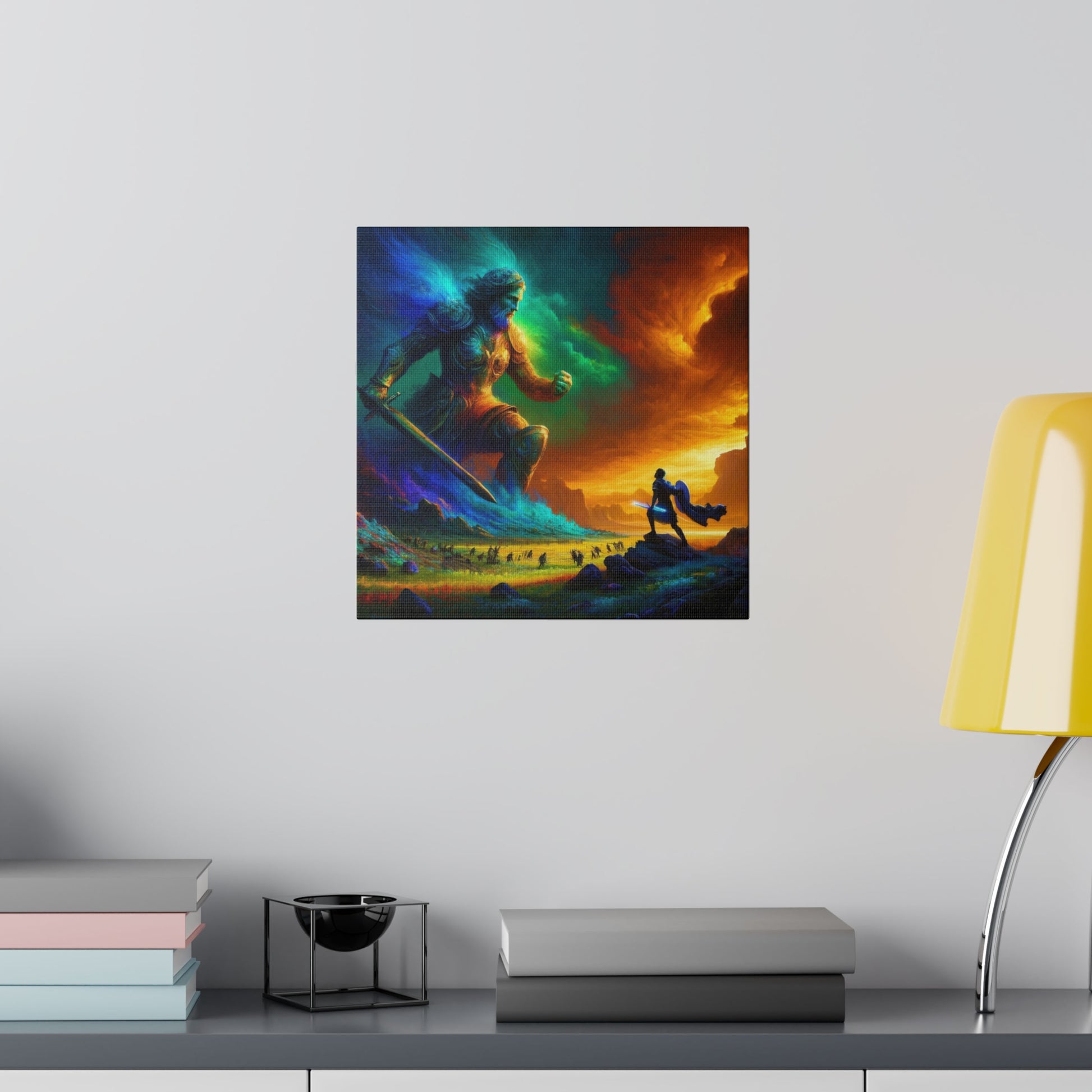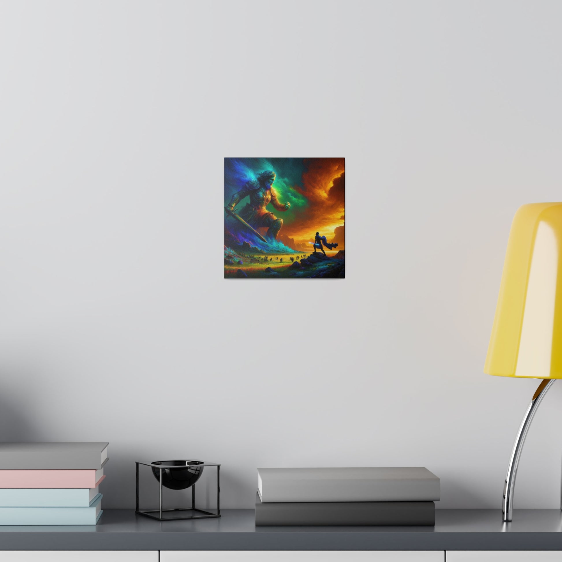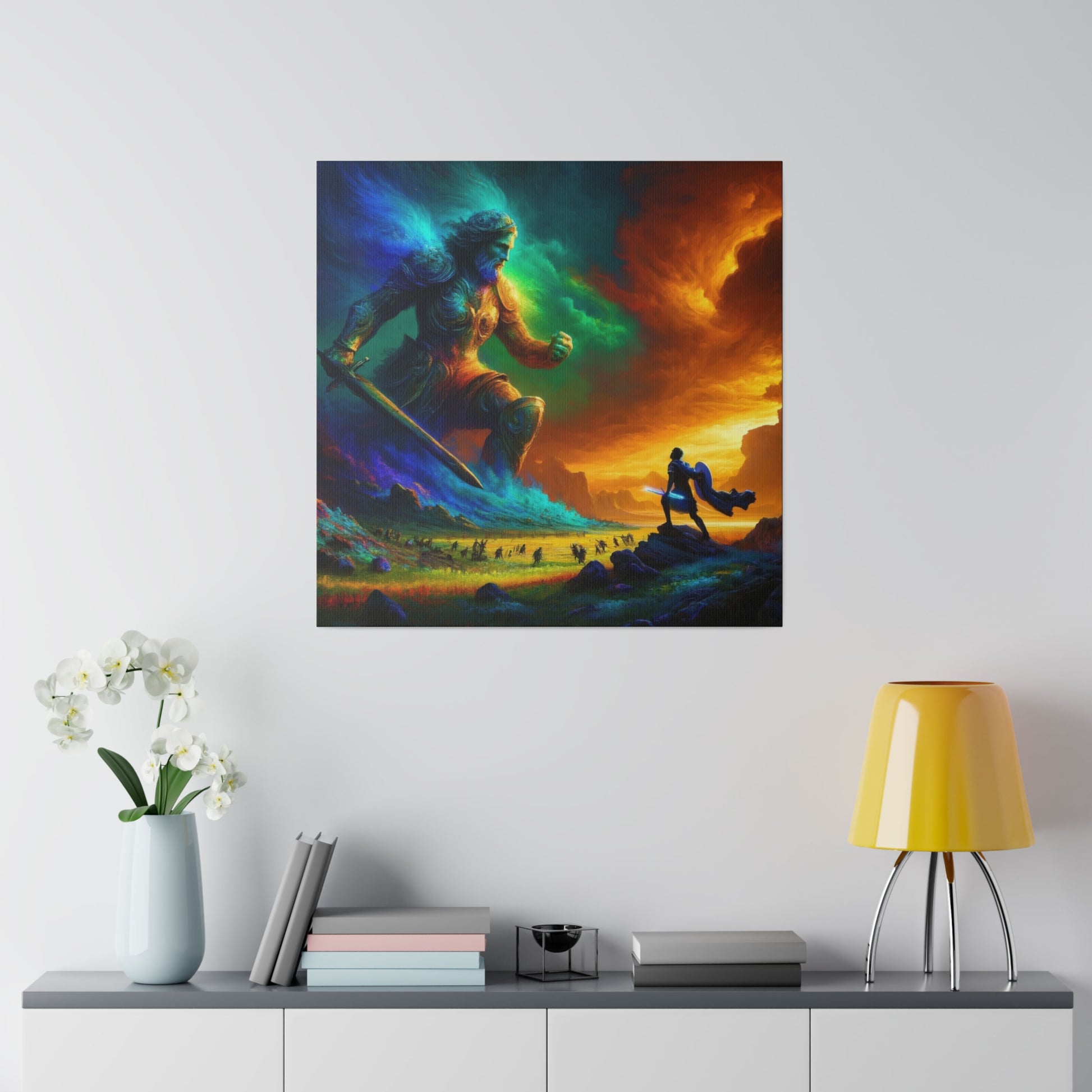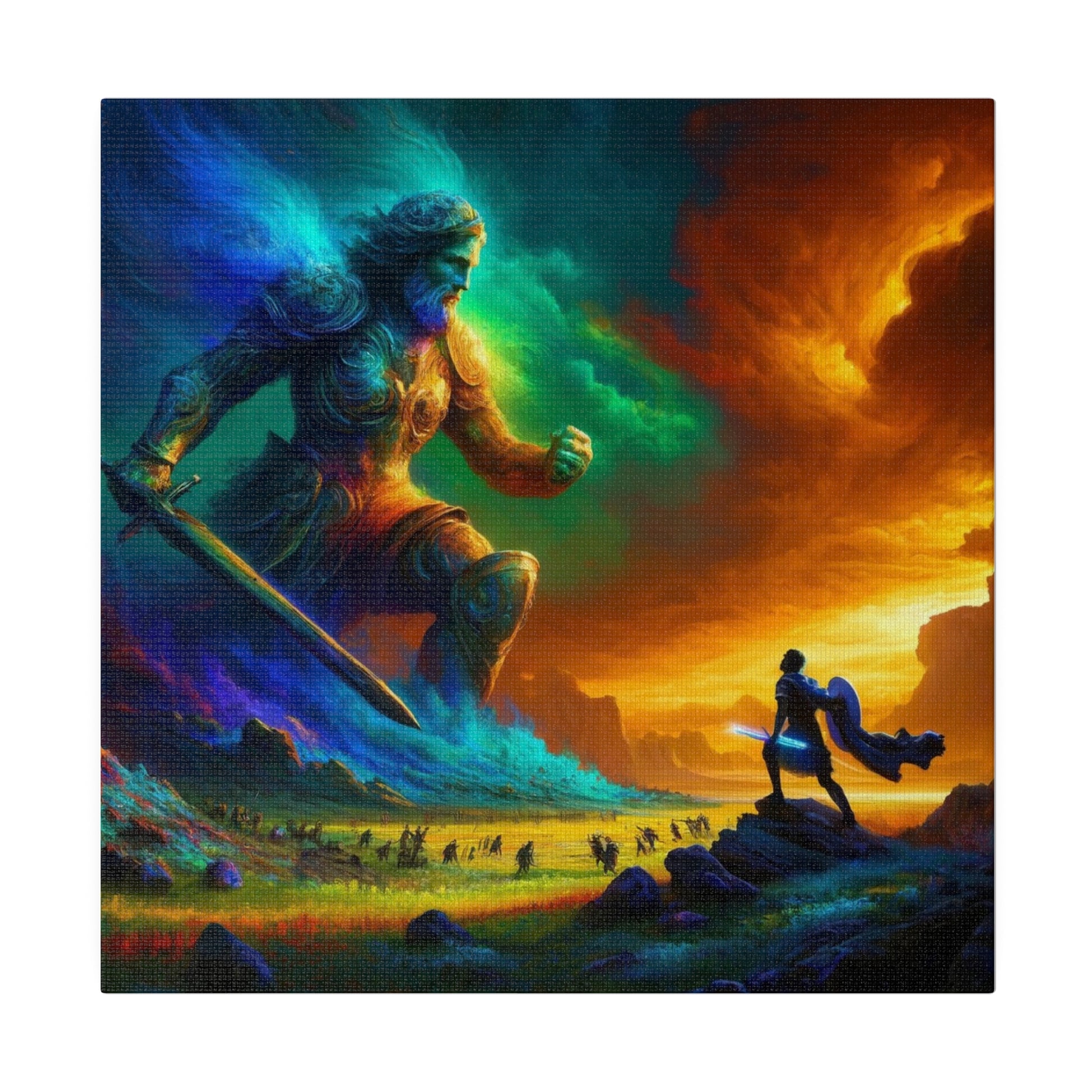 David and Goliath battle, featuring even more intense color contrasts and vibrant elements.