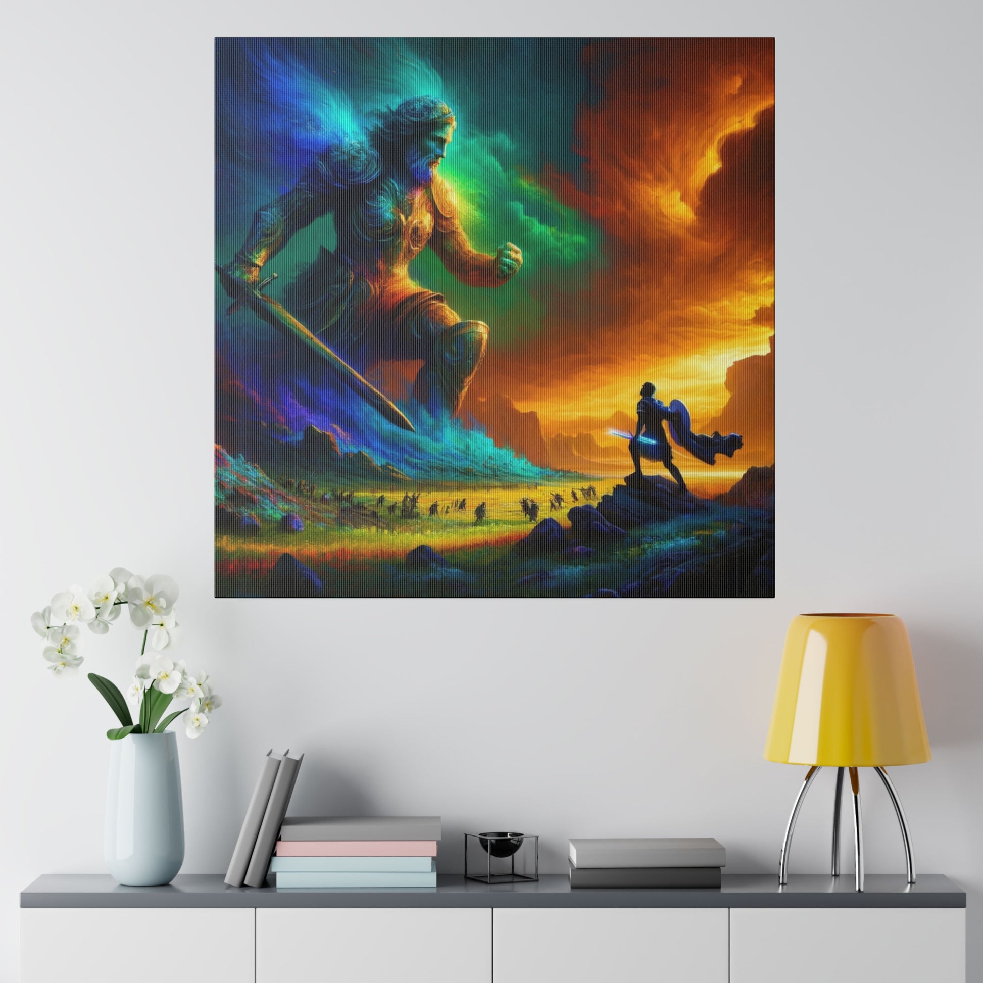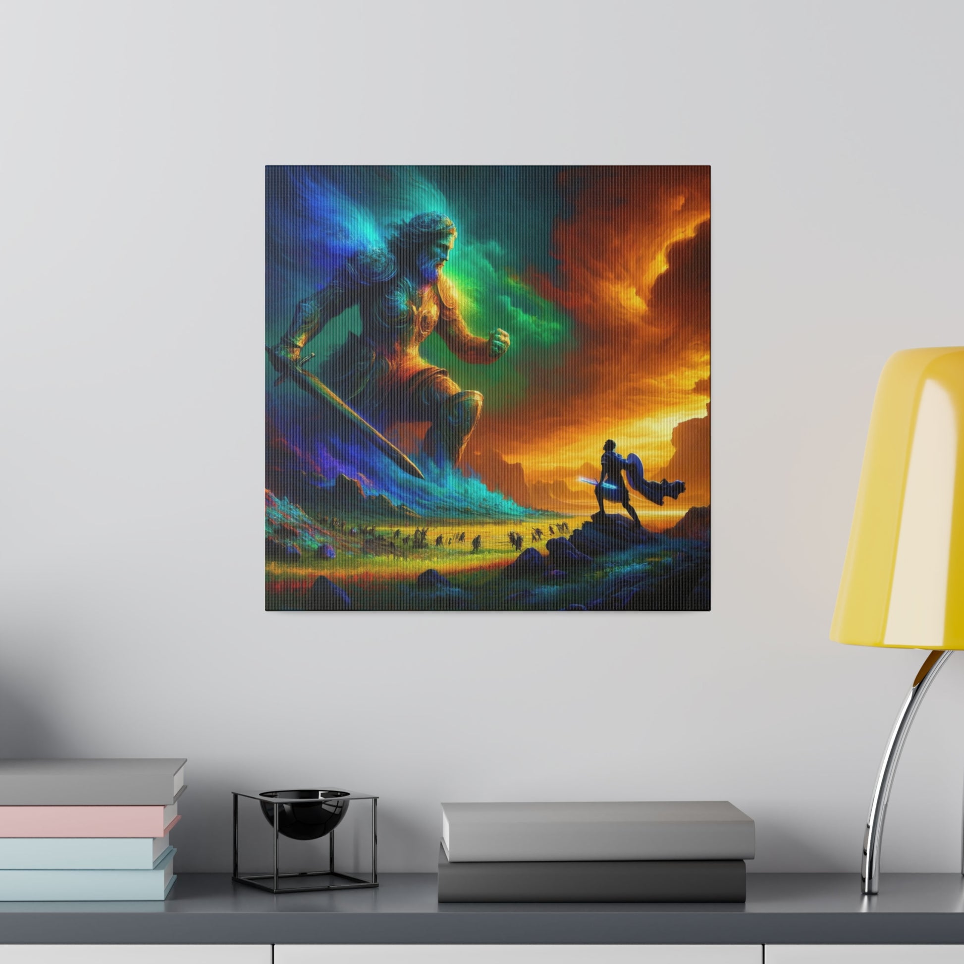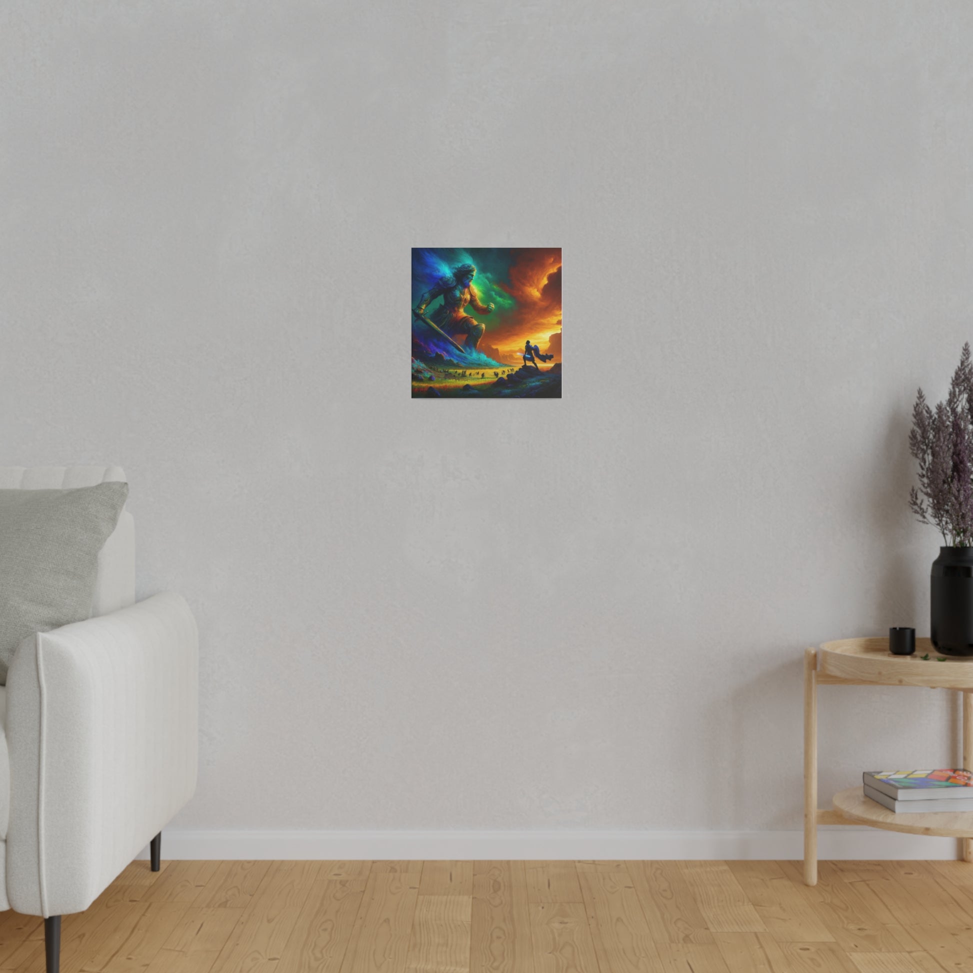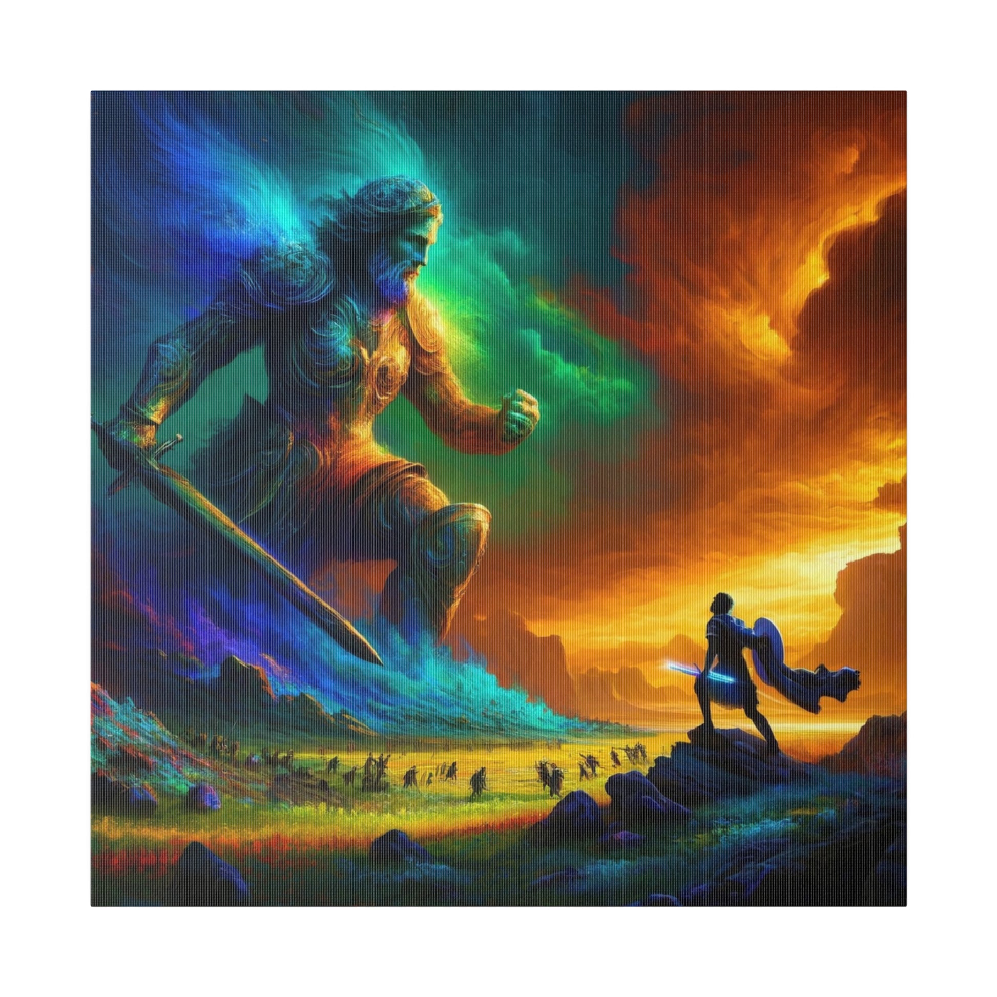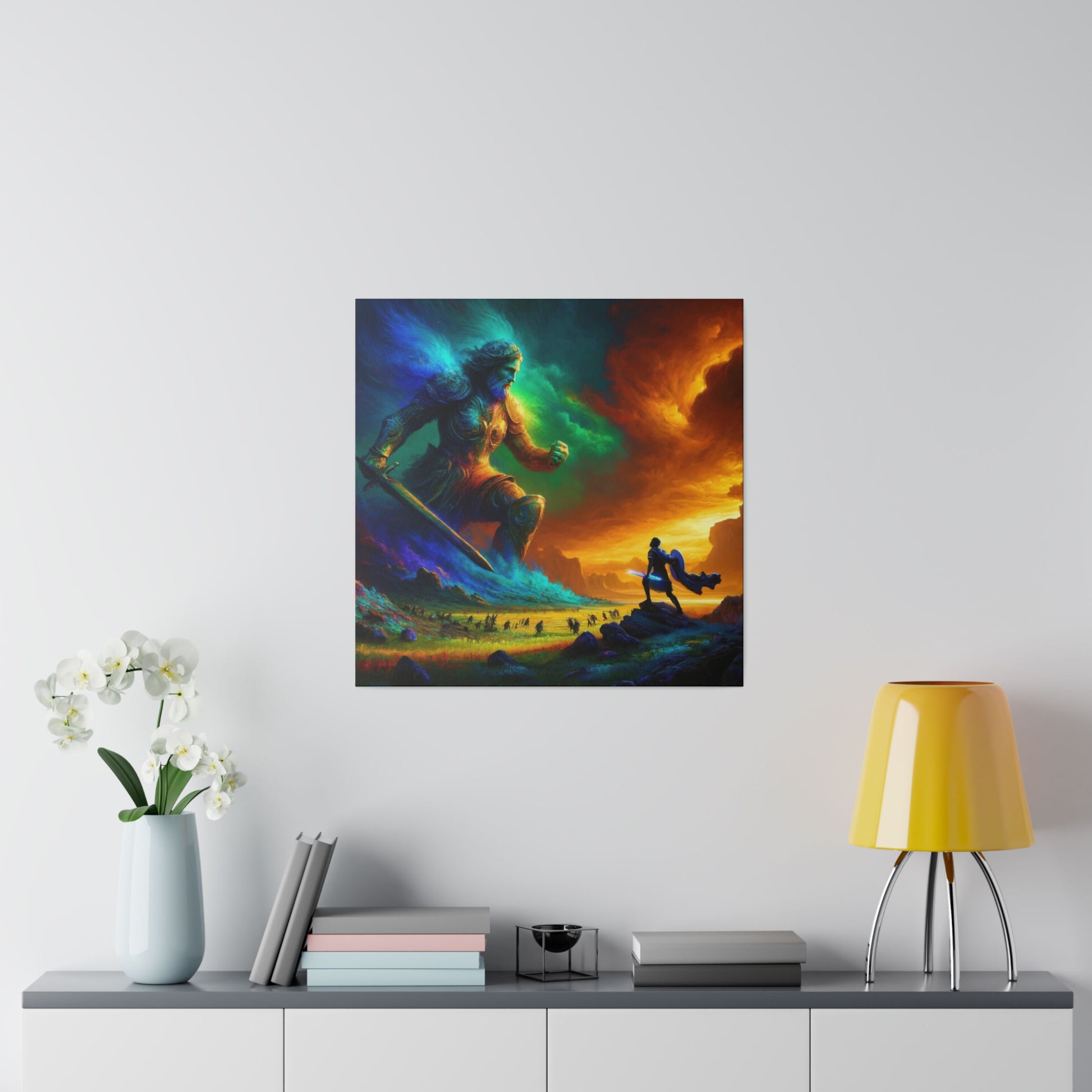 David and Goliath battle, featuring even more intense color contrasts and vibrant elements.