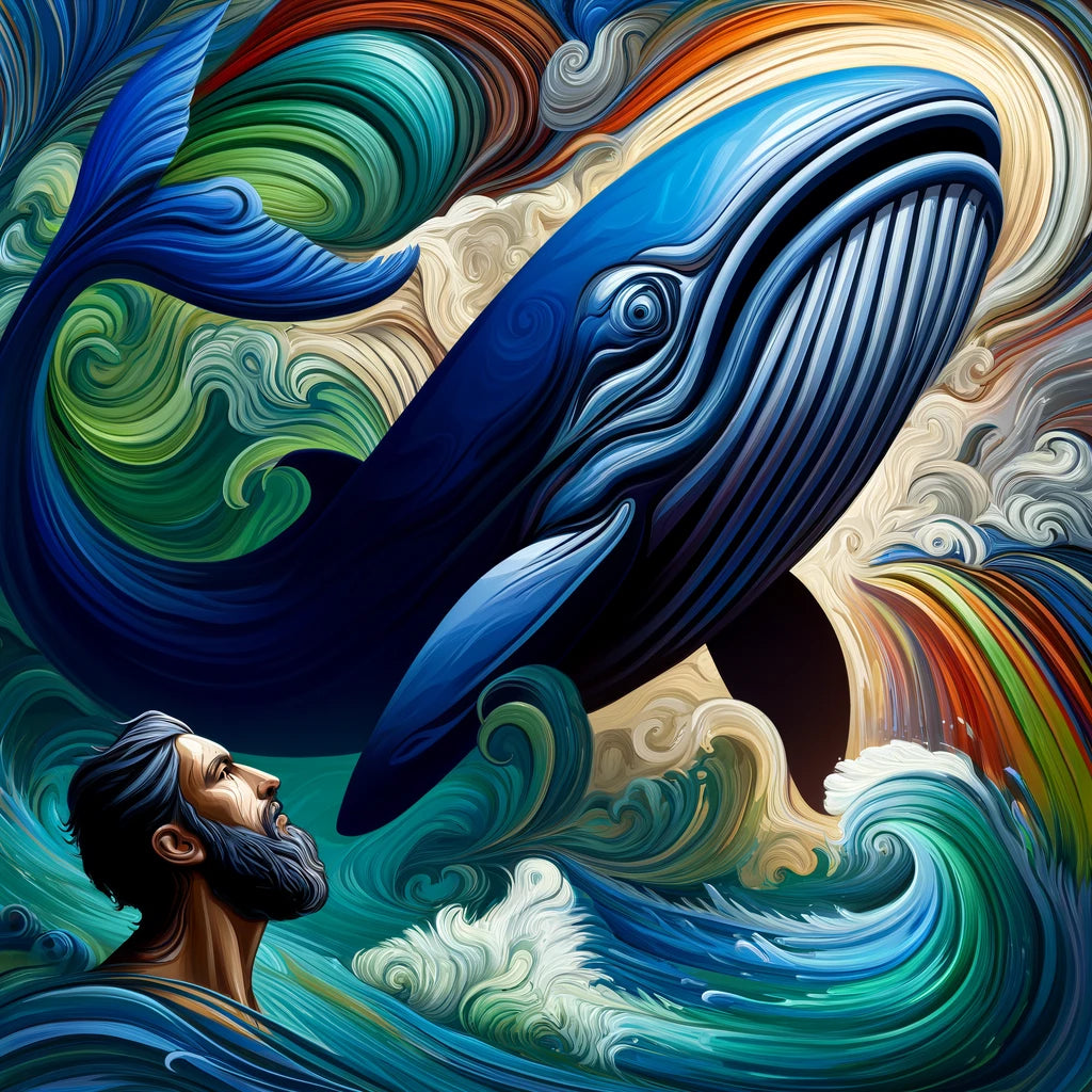 An abstract art depiction of Jonah and the whale, focusing on the grandeur and mystery of the whale. The whale is rendered in darker, more imposing abstract shapes in a palette of navy and midnight blue with hints of metallic silver, while Jonah is subtly integrated using lighter, flowing forms. The background bursts with sea-inspired colors, enhancing the sense of the vast, swirling ocean.